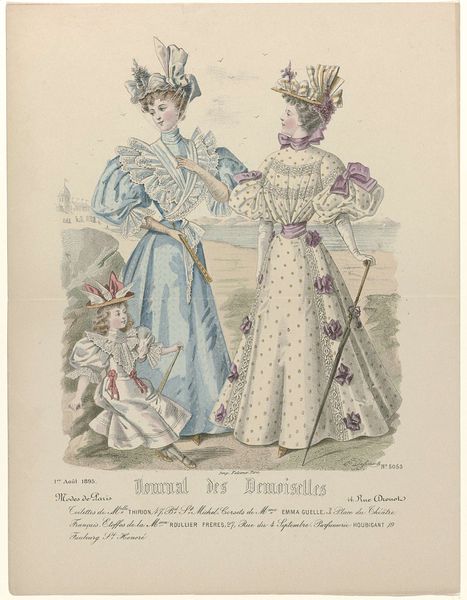P. Deferneville created this print of 'Journal des Demoiselles' in 1894 using engraving and stencil coloring. Immediately, one notes the contrast between the subdued background and the vibrant dresses, drawing our eyes to the figures and their attire. The composition subtly questions traditional portraiture by flattening the picture plane. There's a tension between the detailed rendering of the dresses and the sketch-like quality of the room. This tension destabilizes the viewer's sense of space, challenging the conventional illusion of depth. Semiotically, the dresses can be seen as signs of status and femininity, while the interior setting suggests a certain lifestyle. The gazes and postures of the figures suggest a narrative of leisure and social interaction, yet the lack of clear context leaves the story open to interpretation. The stark graphic quality combined with intricate detail reveals an interest in how the language of fashion communicates identity. Through the artwork's structure, Deferneville asks us to consider the codes and meanings that construct our understanding of beauty and class.