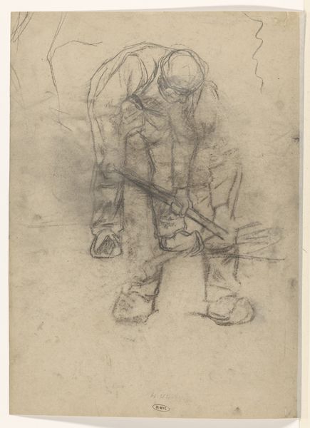 Editor: This is "Voorovergebogen figuur," or "Figure Bent Over," a drawing by Jac van Looij, probably created sometime between 1865 and 1930, made with pencil. I’m struck by how immediate and raw it feels – like a quick observation captured in just a few strokes. What do you see in this piece? Curator: It speaks of labor, doesn't it? The bent posture, the head bowed, all suggesting someone engaged in physical exertion or perhaps weighed down by burdens. Consider how the artist uses line. Notice the heavier shading around the torso—almost like armor or a protective shell. How do you think that impacts the overall feel? Editor: It definitely adds weight and a sense of gravity to the figure, making it feel less like a fleeting sketch and more like a study of resilience under pressure. Is it meant to be empathetic? Curator: Perhaps. The posture itself is a universal symbol, transcending time and culture. Bending over can represent humility, servitude, or even defeat. Think of religious iconography – figures bowing in prayer. But it also speaks to strength, the ability to endure hardship. I am struck by how the incompleteness evokes universality. What details would ground this image more firmly in its own time? Editor: Probably clothing or some context about the person or place. Without those, the feeling is just timeless and more broadly resonant, as you said. Curator: Precisely. The artist provides just enough detail to spark our empathy and understanding of this burdened figure while leaving ample space for individual interpretation. And ultimately invites a potent response! Editor: I see the echoes of that symbolism now. It’s more complex than just a quick sketch. Thank you!