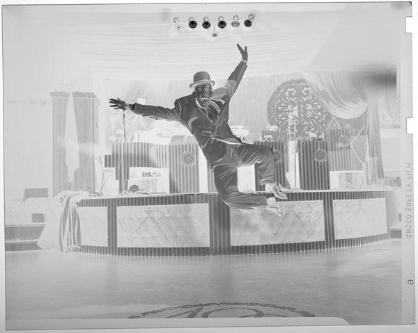Editor: So, this image, "Untitled (comedian dancing and jumping with legs and arms apart)" by Jack Gould, captures a performer in mid-air. It's got this energetic, almost frantic vibe to it. What catches your eye when you look at it? Curator: It’s like a freeze-frame of pure, unadulterated joy, isn’t it? He’s defying gravity, almost daring you not to smile. I wonder what tune was playing when Gould snapped this? The hat floating above his head—it's that little touch of the surreal that elevates it. What do you make of the inverted image, does it make you look at it differently? Editor: I think it enhances the strangeness, a bit like a dream. I hadn't thought about the music, though. Curator: Exactly! It becomes less about documentation and more about feeling. A shared moment of lightness and release. Editor: I guess that's the magic of a good snapshot, isn't it? Curator: Precisely! It’s not just what you see, but what you feel.