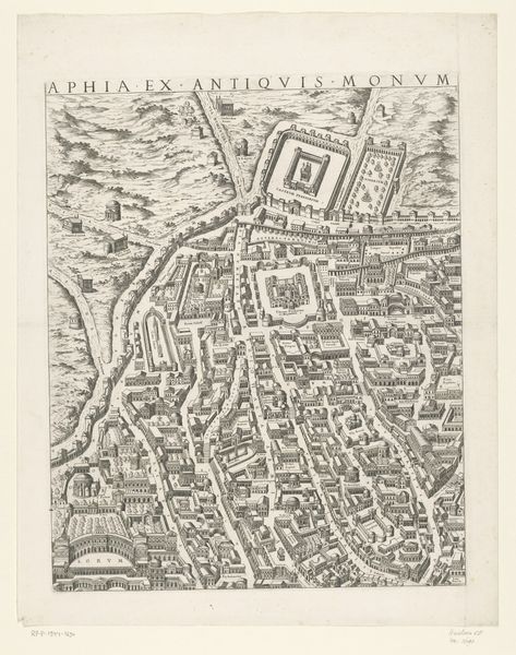 Étienne Dupérac made this map of Rome in the Roman period using engraving, a printmaking technique that demands precision and control. Look closely, and you’ll notice the dense network of lines that define the city's ancient structures. The incised lines hold the ink, transferring an image of the ancient city onto paper. This process wasn't about spontaneous gesture, but rather about calculated and exacting labor, typical of printmaking in the Renaissance. The material—copper—is critical here: its hardness allowed for the detailed, durable matrix needed for multiple impressions. Each print pulled from the matrix could disseminate Dupérac's vision of Rome far and wide. Consider the social context: this wasn't just art, it was information. Maps like these were crucial for urban planning, military strategy, and asserting cultural dominance. The act of engraving and printing transformed Rome from a physical space to a portable, reproducible concept, thus democratizing access to the city’s image. Appreciating the craft, and the way it was made, helps us understand this image's historical significance.
