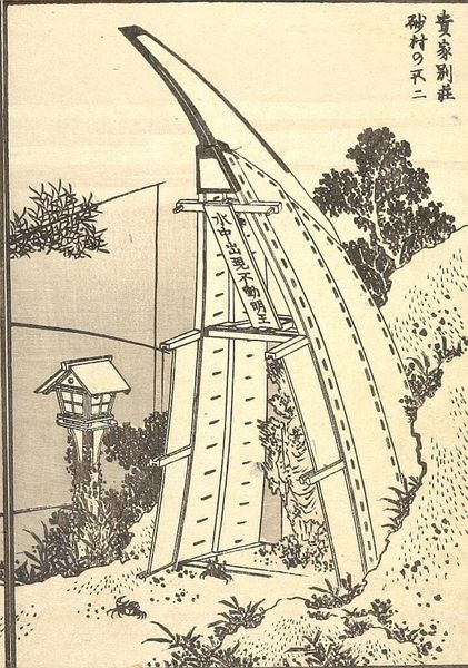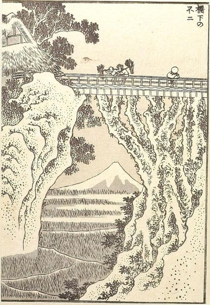 Curator: This is Hokusai's woodblock print, "Summer Fuji in Inage-ryo", a page extracted from his renowned series "One Hundred Views of Mount Fuji." Editor: It's quite striking! The muted tones give it an almost dreamlike quality, despite the busy scene of daily life depicted. Curator: The composition is very intentional. Note how the strong vertical lines of the fences and structures contrast with the gentle curve of the distant Mount Fuji. Editor: And the figures carrying what appear to be bundles of reeds! It’s a snapshot of rural life, isn’t it? Hokusai always finds a way to make the ordinary feel extraordinary. Curator: Indeed. He masterfully uses perspective and detail to draw the eye through the landscape, reminding us of the mountain's ever-present gaze. Editor: There is a sense of harmony between the human activity and the natural world. The mountain might as well be a silent observer. I find this image soothing. Curator: A harmonious blend, I agree. It showcases Hokusai’s profound connection to his environment and his artistic genius.