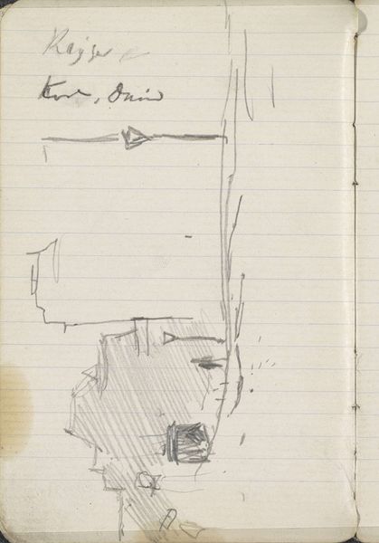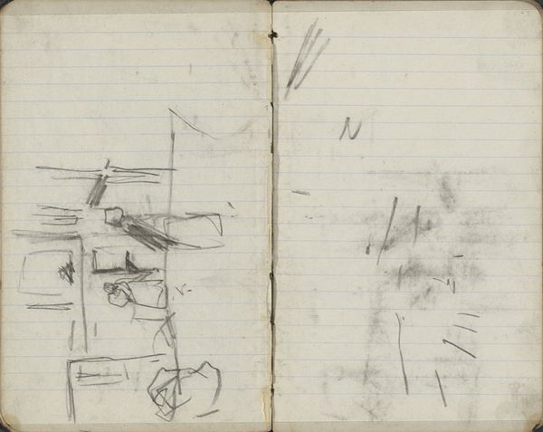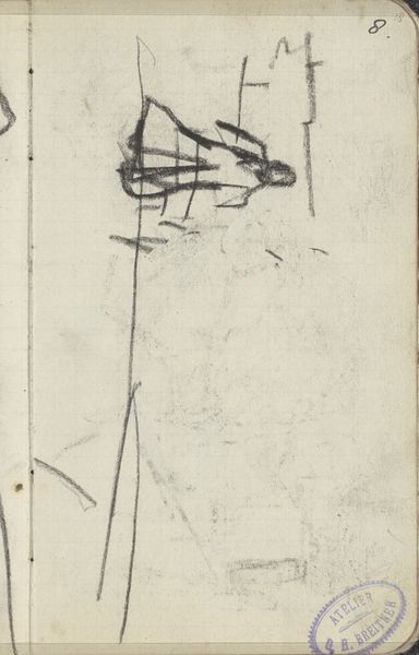 Curator: Welcome. Here we have a sketch by George Hendrik Breitner, titled "Dak van de Nieuwe Kerk te Amsterdam," dating from 1893-1894. It is currently held at the Rijksmuseum. Editor: My first impression is that this pencil drawing, on what appears to be notebook paper, gives us a surprisingly intimate glimpse into the architectural details of Amsterdam. Despite its sketch-like nature, the skeletal structures of the roof suggest monumentality and grandeur. Curator: Indeed. Breitner’s use of line, particularly the rapid, almost frantic strokes, creates a sense of immediacy. We see Breitner's fascination with form. Notice how the geometric shapes intersect and overlap, forming a complex interplay of angles. Editor: Absolutely. However, what's compelling to me is considering the social and economic factors at play in Breitner's Amsterdam. The New Church was, and is, inextricably tied to the Dutch monarchy and moments of national significance. It's worth asking how such an unfinished, stark rooftop might reflect the rapidly industrializing world below, a world teeming with disenfranchised communities also vying to claim the future. What voices are conspicuously absent from these rafters? Curator: A valid point, although the visual economy of the sketch interests me. Breitner does not offer a perfect perspectival rendition; instead, we see only critical lines which gives rise to an almost abstract study. We are compelled to contemplate spatial dimensions without any burden of unnecessary representational detail. Editor: Yet it begs the question of who had the privilege to even contemplate these views of Amsterdam undisturbed, removed from street-level existence. While the marks may feel informal and immediate to you, they come from a body already positioned within systems of power. The lack of surface details suggests the inaccessibility of this kind of reflective privilege. Curator: I find it rather brilliant that such few lines give such vivid form. The composition almost becomes sculptural, highlighting its skeletal aesthetic. The artist does not seek to give us anything besides what we strictly need to see. Editor: I agree it provokes powerful associations between economic mobility and seeing, especially from certain heights within society. Thank you, it makes you really think. Curator: A rewarding example of line meeting form.
