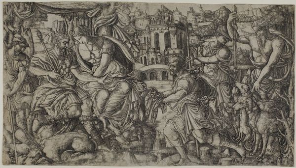 Editor: This is Jean Duvet's print, "Henry II and Diane de Poitiers," housed at the Harvard Art Museums. It's incredibly detailed. What symbols or visual motifs stand out to you in this piece? Curator: Look at the figures themselves. Henry II, with his scepter, echoes authority, but it's Diane who often commands the eye. Notice her symbols – crescent moons, allusions to Diana, the huntress. This wasn't just portraiture; it was about crafting a myth, wasn't it? Editor: A myth? Curator: Absolutely. This image is a carefully constructed narrative, almost an allegory. The dogs, the landscape, even the city in the background - all carefully chosen to convey power, love, and perhaps a carefully curated image for posterity. What do you make of that? Editor: I never considered how intentional the symbolism was. It makes the work much more complex. Curator: Indeed. And that is the power of visual language, isn't it? It shapes how we remember and interpret history.