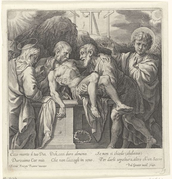 Editor: Here we have "Circumcision," an engraving made around 1590 by Aegidius Sadeler II, currently housed at the Metropolitan Museum of Art. It strikes me as remarkably formal and detailed, especially given its relatively small scale. What stands out to you in this piece? Curator: The "Circumcision" operates on multiple symbolic levels. The central act, rendered with Mannerist elongation and dynamism, signifies not only the ritual itself, but also themes of sacrifice, covenant, and the foreshadowing of Christ’s Passion. Consider the frame: do you notice the Latin inscriptions? How might these words contribute to the engraving’s layered meaning? Editor: I see the inscriptions, but I confess I don't read Latin fluently. They’re almost like... textual emblems surrounding the central image. Are the objects framing the scene symbolic too? Curator: Precisely. The objects depicted—the anchor, the butterfly, even the burning altar at the base—each contribute to a symbolic dialogue. The anchor might represent hope and steadfastness, the butterfly transformation and resurrection. In combination with the ritual depicted, Sadeler weaves together temporal, spiritual and philosophical associations that would be instantly recognizable to a 16th-century viewer, embedding it within the tapestry of cultural memory. Editor: So, it's less about a literal depiction of the event and more about alluding to its deeper, enduring significance through this elaborate symbolic language. Curator: Exactly! And note the architecture—more suggestive than descriptive, providing a stage for the unfolding drama and underlining its historical weight. Sadeler's composition guides us through layers of meaning. Editor: This has completely reshaped my understanding; I had initially overlooked the importance of those surrounding symbolic objects, focusing only on the central scene. Thanks for the insights! Curator: And thank you for observing these details! Paying attention to these components can truly enrich our comprehension.