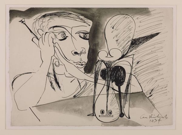 Curator: Here we have "Vrouwenhoofd en meeuwen met op de achtergrond de zee" by Leo Gestel, a striking ink drawing from between 1891 and 1941. It's currently housed here at the Rijksmuseum. Editor: The instant impression is of something…almost elemental. The stark contrast, the way the shapes kind of tumble over each other, feels very turbulent. Curator: Gestel’s real economy of line really captures a mood here. Look at the balance; the woman's face, rendered with these strong, decisive strokes, dominates, yet the frantic energy of the seagulls and sea commands attention as well. It speaks volumes, and does so quickly. Editor: There's this interesting tension between the stillness of the face and the chaotic movement of the gulls. Semiotically, the head, rendered almost classically in profile, could represent rationality or calm and the swooping gulls representing an overwhelming tide of anxiety or feeling. Curator: Or perhaps the eternal back and forth between our inner selves and the world swirling around us. Ever been lost in thought while waves crash on the shore, totally unconcerned with the outside world, only your thoughts and feelings filling the emptiness? This image has those feelings somehow. Editor: It’s fascinating how Gestel merges figuration with abstraction so seamlessly here. The modernist aesthetic, really distills everything down to its barest essentials, revealing, in a way, an inner psychological landscape. Curator: Yes. He teases out something universally human through this interplay of representation and abstraction. It really pulls you in. Editor: For me, the genius is that it makes me ask more questions about myself. After consideration, it's clear that Gestel's brilliant piece here invites us into a silent conversation, one that perhaps changes with each viewing. Curator: Absolutely, I come back to Gestel's stark portrayal of humanity and nature every time and, in its lines, I find a echo of a deeper, more personal conversation. A true sign of enduring art.