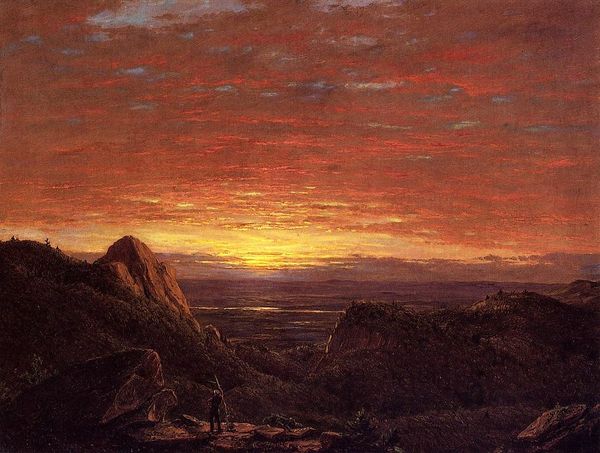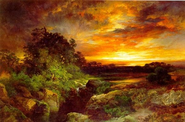 Thomas Moran created this landscape, The Evening Hunter, using oil paint, a medium that allows for rich colors and subtle gradations. Moran’s application of paint, particularly visible in the sky, showcases a blending technique to capture the fleeting light of dusk. The material properties of oil paint—its viscosity and drying time—enabled Moran to build up layers, creating depth and texture across the canvas. Look at the way he has used these qualities to depict the rocks and foliage with a tactile realism. The brushwork here is quite traditional, consistent with the broader history of landscape painting, yet it also hints at the industrial context of its creation. The paint itself, commercially produced and readily available, reflects the rise of consumer culture in the late 19th century. Moran’s choice of subject matter—a serene landscape—is a testament to the value placed on the natural world. However, it also speaks to a certain romantic ideal, obscuring the realities of labor and resource extraction that were transforming the American landscape.