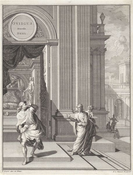 Editor: This etching, "Tempio Antico," was created by Giovanni Battista Piranesi around 1748-49. It’s stunning – almost overwhelming, really. All those lines and the sheer scale of the architecture... It’s grandiose but also kind of dreamlike. What do you see in this piece? Curator: I see echoes. Piranesi wasn't simply depicting architecture; he was conjuring the weight of Roman history and imperial power. Consider the temple itself: it’s a visual embodiment of Roman ambition and architectural innovation. Notice the figures; they're dwarfed by the scale, rendered anonymous, almost like ghosts amidst the ruins. Does this imagery tell us anything about how empires preserve their identity, and continue to exist through visual memory and association? Editor: I see what you mean, it is more than just documenting architecture. But what about the details he chose to include, the statues and smoking braziers for instance? Curator: Excellent question! These details are not arbitrary. The statues are visual quotes of past eras, acting like anchors in time, constantly reminding us of Rome's layered history. The braziers with their smoke add a sense of drama and ritual. The smoke itself can be interpreted as the transience of power. These things evoke cultural memory; but are they reliable records or powerful cultural symbols performing a function? Editor: So he is using the images of Roman grandeur, not necessarily to celebrate, but to… to hint at something more complex? Curator: Precisely. He is actively inviting us to contemplate our relationship to the past. And he is showing us the way that our cultural and visual heritage has symbolic undercurrents and consequences. How we relate to symbols defines much of what it means to be part of culture itself. Editor: That's fascinating. I’d only thought about it in terms of style and technique before, but now it's clicking into place for me! Thanks! Curator: My pleasure. It is the images, the iconography itself, that allow us to touch what is hidden from the naked eye.