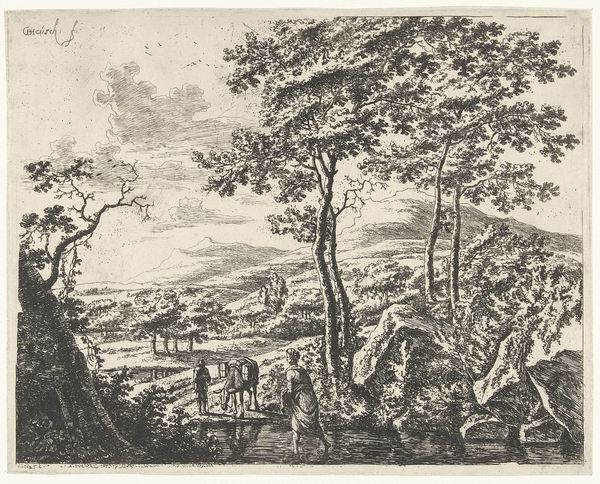 Curator: Okay, let's delve into this fascinating Northern Renaissance drawing. It's entitled "Landschap met vrouw en kind," or "Landscape with Woman and Child," created in 1539 by the German artist Monogrammist PS. Editor: Wow, it’s a tiny universe captured in ink! Intricate, almost obsessively detailed. The mood? A kind of serene unease…like a fairytale about to take a dark turn. Curator: That uneasy serenity is interesting. Consider the socio-political context of the 16th century—religious Reformation, peasant wars. Landscapes weren't just pretty pictures; they often served as allegories reflecting anxieties and upheavals. Editor: Allegories make my head spin sometimes, but I can definitely see it. Look at that almost gothic skyline in the background versus the placid woman and child. The artist seems to be saying that even pastoral beauty exists under a looming shadow. Curator: Precisely. And let's not overlook the deliberate choice of medium: pen and ink drawing, lending itself to that meticulous detail we mentioned. This allows for precise symbolic representation of contemporary morality, but, I find myself wondering what narrative this image offers, and, indeed, to whom. Editor: It's like visual poetry, isn't it? The way the line work creates textures – the bark on the trees, the folds in her dress. Even though it's a reproduction it breathes with such intimacy. Did this artist see this scene in person, do you think? It has to be rooted in reality, doesn't it? Curator: Art historians posit a synthesis of observed and imagined elements in these early landscapes. There's definitely a sense of real places rendered through an ideological lens. This perspective suggests that the woman and child are posed for the purposes of observing humanity in relationship to the land. The implications can be rather profound. Editor: Hmm, well it leaves you with lots to consider, doesn't it? It whispers more than shouts and asks so many questions of us. I like that, really. Curator: I agree. This drawing acts as an example of artwork's incredible power to spark these important dialogues through time.