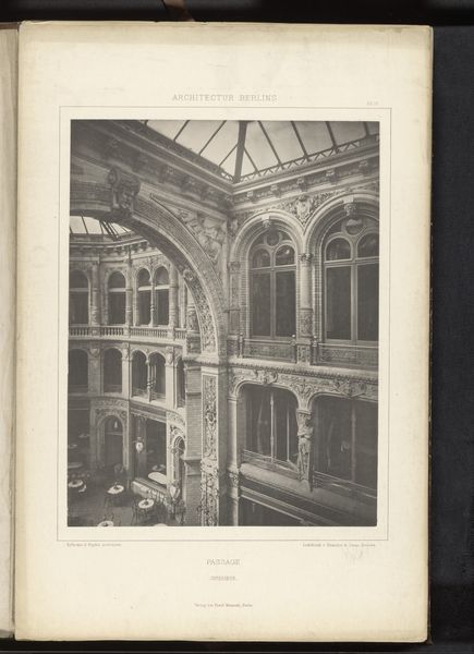Curator: This photogravure, "Gezicht op het interieur van een passage in Berlijn, Duitsland," or "View of the Interior of a Passage in Berlin, Germany" as we'd say in English, dates from before 1877. Although the artist is unfortunately unknown, it now resides here at the Rijksmuseum, and offers an interesting look at the aesthetics and anxieties of late 19th-century urban life. Editor: Oh, wow, my first thought? Stage set. All those arches, the ornate detailing, the way the light falls—it feels incredibly theatrical. And the perspective almost exaggerates that effect, like looking up into a proscenium. Curator: Yes, the architectural elements create a defined hierarchy and a rather imposing visual statement. There’s a strong emphasis on verticality, reinforced by the use of columns and window placement, and this creates a sense of grandeur. Considering the period, this photograph also captures a specific burgeoning sense of modernity. These passages were not just spaces for commerce. Editor: Absolutely, and to my eye there is almost a sense of voyeurism; we are looking up to the stage as outsiders—as tourists, almost, peeking into a world carefully designed for consumption. Even if the artist remains unknown, their composition makes an unspoken commentary about observers in the modernizing world. Curator: It's about the spectacle of progress, but in a way it is designed to contain the anxieties. Notice the regularity of architectural patterns, balanced symmetry—it’s very geometric. The repetition serves a psychological function. Even though cities were becoming overwhelming spaces, the order presented in photographs like this suggests control, which makes these anxieties bearable. Editor: You know, thinking about it more, that order also hints at a deeper instability, doesn't it? Almost like a gilded cage. It reminds me of certain narratives around that period’s architecture and mindset; it’s not simply documenting but maybe masking something turbulent that churned below the surface. Curator: A potent and astute observation, especially considering the city’s trajectory in the decades to follow. This image speaks volumes, regardless of who actually captured it. Editor: Absolutely. Makes me feel differently about window shopping.