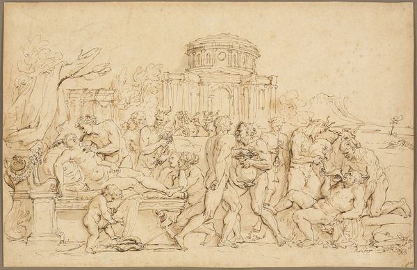Gaetano Gandolfi created this ink drawing titled "A Triumphal Procession in Ancient Rome" in the late 18th century. Gandolfi, living in a time of shifting political power, looked back to the Roman Empire and its imagery of military strength and imperial glory. But this wasn’t just a neutral historical scene. Think about it: who gets to be the hero in these stories? Gandolfi’s Rome is populated by idealized figures, likely excluding the voices and experiences of women, enslaved people, and those from conquered territories. The triumphal procession was a carefully staged event, designed to reinforce the power of the ruling elite and the state. What does it mean to depict such a scene, knowing its inherent inequalities? The emotional impact of this drawing lies in its ability to transport us to another time, while simultaneously inviting us to question the narratives it presents. Gandolfi doesn't offer a straightforward glorification of power; instead, he hints at the complex social dynamics and the human cost of imperial ambition.