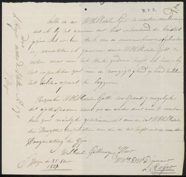 Curator: Here we have "Brief aan August Allebé," thought to be from 1894, by Evert Slaghek. It's currently held in the Rijksmuseum collection. Editor: It feels so fragile and intimate. Look at that delicate ink on paper, like holding a whispered secret. What were the societal expectations on penmanship, and what stories could we infer from that, that are invisible now? Curator: Absolutely. Slaghek's labor in crafting this letter speaks volumes. Think of the precise hand movements required for such elegant penmanship, especially considering it's likely done with a quill. Editor: You can really sense a time of specific craft and labour expectations. Were you required to be neat and beautiful in your lettering to even have work back then? Curator: Exactly! It highlights class distinctions and educational access. Someone with the resources to master calligraphy held a different social position. The paper itself, its quality, even the ink—all point to socioeconomic factors. The letter form, as you were noting earlier, whispers social hierarchy, but in a world before rapid mechanized communication. It really asks you to question what types of art still communicate this clearly now. Editor: Right. We can explore how literacy rates, or lack thereof, further cement societal power structures during the late 19th century in the Netherlands. So the skill of handwriting really solidifies communication? Curator: It was more than that. Calligraphy conveyed intention, social grace, and personal expression, while mirroring those structures of power. It's fascinating how something as seemingly simple as a letter becomes such a rich artifact of its time. The act of reading it even changes through time. Editor: Seeing the material aspects – the paper, the ink, the precise craftsmanship – reminds me that we’re viewing not just a message, but the remnants of complex social forces at work. So something can survive the ages but change in context as our society changes. Curator: I think reflecting on those shifting interpretations, and the continued influence of social structure on what we deem "art" and "craft", enriches our understanding of "Brief aan August Allebé," and how we read artifacts in our society now. Editor: It’s not merely about the text but the whole picture of societal standards back then that help define where the value of something existed. That continues to hold importance for us even today.