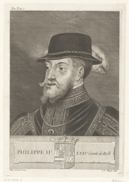 Curator: This engraving from 1650 is titled *Portret van Filips II, koning van Spanje,* and was created by Cornelis Visscher. It resides here at the Rijksmuseum. Editor: My immediate reaction is one of severe constraint. The visual field is tightly packed, the subject is encased, and his expression, though refined, hints at a certain tension. Curator: It's exemplary of Baroque portraiture, isn't it? Look at the meticulous rendering of texture—the velvet hat, the sheen on his doublet, the fine lines articulating his face. It's a study in detail. The oval frame enhances the dramatic impact. Editor: I think there's a specific, potentially propagandistic tension here, as it situates Philip II. Consider how Philip's reign was a time of enormous strife in the Netherlands, characterized by the persecution of Protestants and the long, devastating Eighty Years' War for Dutch independence. This engraving presents us with an image meant to legitimize power amid conflict, obscuring the violent reality through visual elegance. Curator: But the technique! Visscher truly masters the art of the line. Look at how he builds up the tonal range through hatching and cross-hatching, creating depth and volume with incredible subtlety. Editor: Yes, the engraving is undeniably skillful, but those very formal elements are part of the ideological project of Baroque art: to awe and persuade through spectacle, whether earned or not. The ornate Latin inscription serves a similar purpose, glorifying the man. Curator: Well, seeing it through that historical lens gives the technical virtuosity another layer, doesn’t it? Visscher’s attention to detail is then a conscious choice aimed to ennoble Philip’s presence. Editor: Precisely. Understanding this historical context, alongside the aesthetic elements, exposes the strategies of power embedded within even the most seemingly straightforward portrait. Curator: A very helpful reminder that even a seemingly neutral portrait speaks volumes. Editor: Indeed, a constant interplay of what is present, absent, and actively obscured, as one analyzes art!