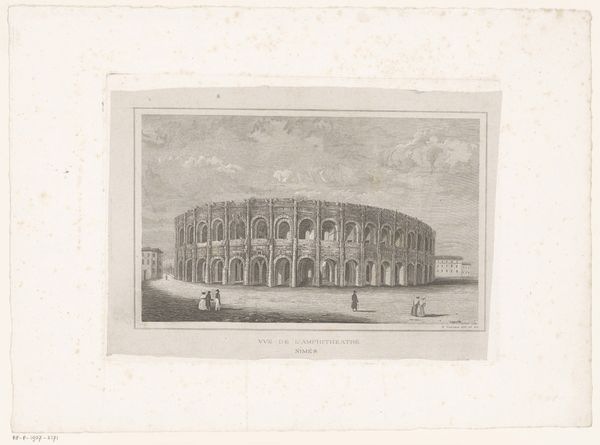 Editor: This is "Gezicht op de Arena van Nîemes" by Bedos, made sometime between 1820 and 1910, a drawing engraved on paper. The precision of the lines detailing the arena is amazing, but what’s up with all the text framing the image? What do you see in this piece? Curator: Beyond its Neoclassical precision, I see a powerful statement about history, power, and cultural memory. The text you mentioned, which is almost overwhelming, situates the arena, but also almost cages it. It speaks to the ways we try to contain and define history through language and documentation, a very colonial approach to the appropriation of ancient structures, and arguably of knowledge itself. Editor: So the text isn’t just descriptive; it’s… assertive? Is the artist making a statement about how we view history? Curator: Precisely. Think about the act of documentation during this period. It often coincided with, and enabled, colonial expansion and the appropriation of cultural artifacts. This drawing, in its seemingly objective rendering, is participating in that process, yet perhaps critiquing it, too. The fragility of the drawing on paper contrasts with the monumental presence of the arena, no? What does that contrast make you consider? Editor: I hadn’t thought of that. It's like the drawing tries to capture the arena's essence, but also reminds us of how much is lost in translation. Is this arena still around? Curator: It is. Thinking about its continued presence, despite all attempts to document and define it, complicates the colonial project, doesn't it? Editor: Definitely. I initially saw just a historical drawing, but I now realize the work engages with contemporary ideas about who owns history. Thanks! Curator: Indeed! It highlights how the "gaze" itself, even a historical one, is always implicated in power structures, offering avenues for critique. Always question the frame, literal and figurative!