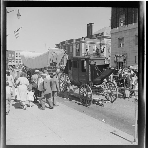 Editor: Here we have Jack Gould's "Untitled (people in old-fashioned clothes on street)," a small black and white photograph. It's quite striking with its image reversal, the subjects looking like ghostly figures observing antique wagons. What do you see in this piece? Curator: For me, this image speaks to the power dynamics embedded in historical reenactments. Who is performing, who is watching, and whose history is being valorized? The inverted tones add another layer, questioning the authenticity of the narrative itself. Editor: That's a really interesting point. So, it's not just about nostalgia, but also about critically examining the past? Curator: Exactly. Consider the absence of marginalized voices in these performances. Are we celebrating progress or perpetuating exclusion? This photograph, for me, prompts questions about how we engage with history responsibly. Editor: I never thought of it that way before, but it makes a lot of sense. Thanks! Curator: It's crucial to remember that history is never neutral, and art can be a powerful tool for deconstructing dominant narratives.