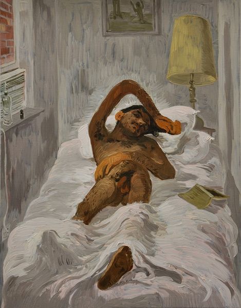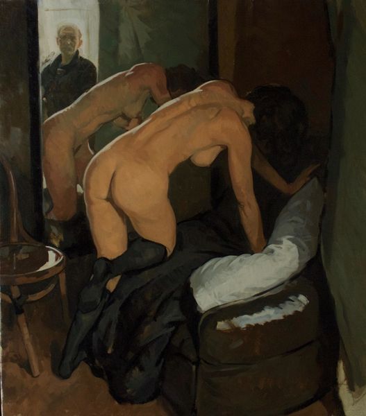 Curator: Rosemarie Beck painted this scene, titled "Two in Room V", back in 1967. Editor: My first thought is that the entangled bodies seem caught between the throes of passion and the aftermath, rendered in these ochre hues, amidst this almost violent choreography within the intimate disorder of a room. Curator: Absolutely. Beck's use of genre painting conventions adds an interesting layer. In the mid-20th century, depictions of intimate life and nudes were undergoing considerable transformation. It certainly reflects broader shifts in social attitudes. The "mess" around them also contrasts ideals around womanhood and motherhood at the time. Editor: Considering the visual language here, though, I'm curious about this 'V'. Beyond a simple room number, could it allude to the Venus archetype, distorted and destabilized in this contemporary rendering? The nude figures, rather than representing idealized forms, seem almost… vulnerable. The shapes also make me think of expressionism and psychoanalysis where bodies show what language conceals. Curator: Indeed, the vulnerability you note disrupts the conventional erotic gaze one might expect. Beck consistently employs classicizing motives – but almost always distorts or disfigures them. The 'V' perhaps speaks to both ‘victory’ and the opposite, suggesting a complexity beneath surface appearances, also, it is impossible to ignore the shadow in this bedroom interior. Is it an inner or outer element for this couple? Editor: Speaking of appearance, there's this clear material aspect; the brushwork is incredibly loose, almost aggressively so in places. Given the broader art-historical trends of that decade, especially with movements challenging formalist conventions, Beck seems intent on bringing raw experience to the forefront, and stripping bare the artifice. It's more the rawness of Courbet than Ingres’ hyperreal and classic beauty, a counter statement to power that beauty embodies. Curator: It's a potent work – really inviting further interpretation on the changing roles of the figures throughout art history. Editor: Indeed, thank you for your wonderful observations today. It adds another piece to this interesting, visual conversation.