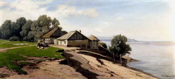 Konstantin Makovsky's "Country Landscape" is an oil painting that presents a dense and earthy composition. Notice how the thatched roofs of the village buildings dominate the scene, their thick, textured surfaces rendered with visible brushstrokes. This layering creates a sense of depth and tactile presence. Makovsky uses a palette of muted browns, greens, and creams that evokes a feeling of the Russian countryside. The artist’s approach to light is subtle; it gently illuminates the scene, casting soft shadows that accentuate the forms of the buildings and figures. The composition has a structural emphasis, with the solid geometric forms of the houses contrasting against the organic shapes of the landscape. This reflects the artist's concern with representing Russia’s cultural identity, rooting it in a traditional and pastoral context. This piece challenges fixed notions of landscape art, moving away from idealized depictions and engaging with a raw, unvarnished view of rural life.