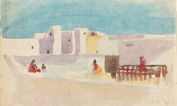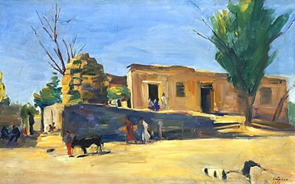 Curator: Looking at this painting by Pedro Figari, called "Toque de Oración" from 1925, it strikes me first and foremost as an observation of labor and material production. Editor: It has a very naive, almost dreamlike quality about it, like a childhood memory viewed through rose-tinted glasses. Curator: Well, Figari's paintings, crafted with oil on canvas, weren't necessarily aiming for pure realism. They were, however, attempting to depict specific cultural scenes, so the context is what shapes our understanding. Note the clothing styles of the figures, typical of the period. It tells a story of Uruguayan society at that time. Editor: Absolutely, but it's not just a historical document. The rough texture, the somewhat flattened perspective… there's a real poetry in the mundane. What kind of painting surfaces did Figari use, and how might these have contributed to his aesthetic vision? Curator: Records suggest he preferred common canvases and supports readily available to working-class artists. This pragmatism allowed Figari to churn out his oeuvre more efficiently and engage in quantity. The application of paint shows broad, deliberate strokes rather than meticulous blending or layering, contributing to its distinctive texture. I also consider how the subject, supposedly a prayer gathering, intersects with material concerns like class, dress and ritual practices. Editor: Yet the mood he evokes! Look at that milky sky, the way the light softens the edges of everything. The praying ladies outside. Is it dawn? Or dusk? Dogs meandering… There’s this palpable quietude that overtakes my thoughts. It's fascinating how he combines almost caricature-like figures with that incredibly atmospheric light. The material's capacity is more symbolic. Curator: And in connecting this technique to a certain availability of resources, you’re reminded how the labor practices behind it inform the style. Figari sought a democratic aesthetic by employing inexpensive materials and an approachable representational mode to make his works accessible and to render them socially symbolic. Editor: So it is! By exploring the socio-political dimensions, he gives his own vision to material. Curator: A lens on value! Editor: Beautiful and insightful.