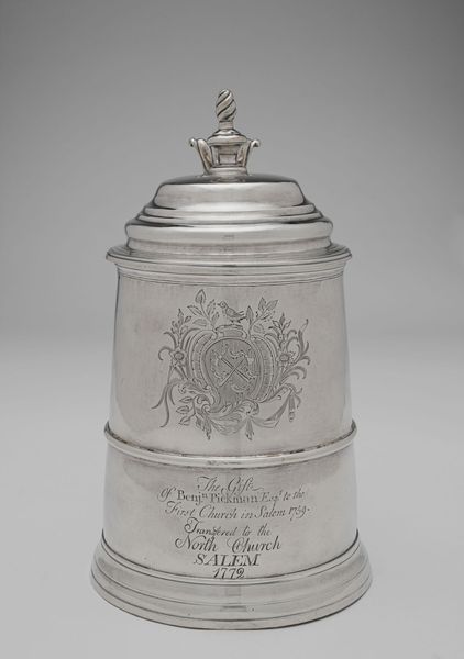 Curator: John Coney, a silversmith active in Boston in the late 17th and early 18th centuries, crafted this tankard, now known as the Clarke/Cabott Tankard, held at the Harvard Art Museums. Editor: The gleam is what first grabs me. It’s not just decorative; it’s functional, speaking to its intended purpose as a communal vessel, perhaps for ritual or ceremony. Curator: Indeed. The tankard bears an elaborate coat of arms, symbolizing lineage and status, further solidified by the inscription stating it as a gift to the North Church in Salem. It reflects the social hierarchies of colonial society. Editor: The labor involved in creating this object is intense. Think of the extraction of the silver, the shaping, the engraving – all evidence of skill and time, reflecting value beyond just monetary worth. Curator: It’s a potent symbol of piety and social standing. The imagery speaks to a desire for lasting legacy, with deep cultural resonance. Editor: Seeing the tankard, I understand how essential materiality is to culture. The silver itself carries the weight of history.