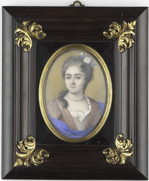 Curator: Here we have Jean-Baptiste Isabey’s watercolor on ivory, "Mrs. Rufus Prime (Augusta Temple Palmer, 1807–1840)," created in 1828. It is housed in an elaborate gilt-bronze and wood frame. Editor: It's striking how the soft pastel tones give such a gentle, almost ethereal quality to the portrait. It’s easy to imagine this hanging above someone's writing desk as a private, sentimental object. Curator: These portrait miniatures served precisely that purpose, operating within a specific socio-political context of family ties, wealth and display. Mrs. Prime came from a privileged background, so this was probably made as a sentimental exchange between family members. Editor: The rendering of the dress and the feathery hat especially highlight her status, almost declaring a carefully constructed identity. Considering the social expectations for women during the Romanticism era, one wonders if this level of refinement masked underlying societal pressures. Curator: Indeed. Women's lives at that time were circumscribed by domestic roles and expectations, yet within those boundaries, individuals exercised agency. A portrait like this immortalizes that agency within those confines, simultaneously reflecting and possibly subverting societal norms. We can examine the sitter's direct, self-possessed gaze as an expression of that agency. Editor: Her look carries the weight of these complex social structures, definitely. The details such as her dress, that elaborate hat with plumes – even the golden frame – each contribute to a narrative of self-presentation amid societal pressures. It becomes something far beyond a mere pretty picture. Curator: And to understand the cultural role of portraiture within elite social strata of 19th century New York sheds light on the public face of art and the implicit politics embedded within even the most intimate of images. Editor: Looking at this piece from that perspective allows us to see the quiet acts of resistance or compliance interwoven in what seems at first glance to be only a delicate miniature. Curator: A compelling reminder that even the smallest artwork can tell a powerful story about the individual and the world they inhabited. Editor: A story waiting to be unpacked through a deep reading of art history!