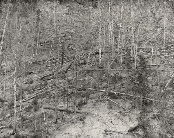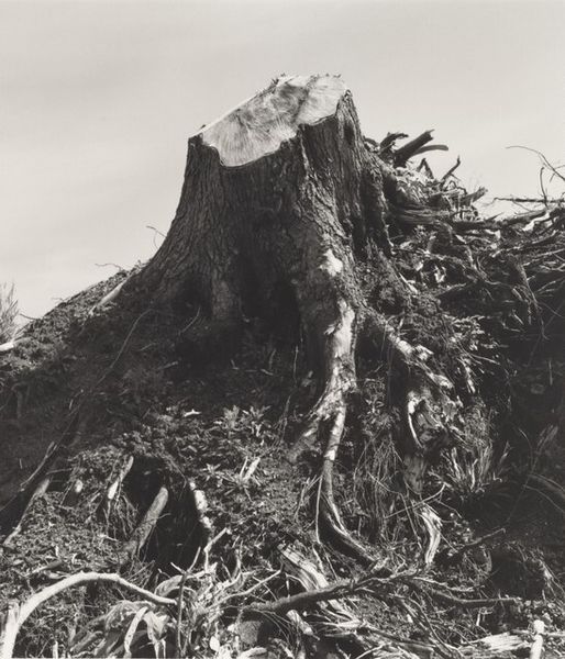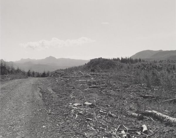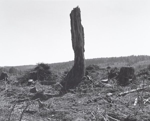 Curator: At first glance, it appears to be a barren landscape. Somber and eerily quiet, wouldn’t you say? Editor: Quiet in the way a scream can be quiet. Robert Adams took this photograph, entitled "Clearcut, Clatsop County, Oregon", in 2001. He gives us this denuded hillside laid bare. The black and white format adds to the sense of desolation. Curator: Adams is known for capturing these kinds of stark images that reveal the impact of human activity on the American West. How might his background and influences have shaped his vision? Editor: I think the prevailing question here is what’s missing from the photograph, rather than what is present. And this question is linked to what histories and communities are erased through such actions. His work really emerged alongside the rise of environmentalism. He saw how postwar development was dramatically reshaping the natural landscape, and he began to document these changes, particularly the effects of clear-cut logging. It challenges our traditional notion of the sublime, you know, where nature is supposed to inspire feelings of awe and reverence. Instead, we’re faced with a scene of destruction, a visual representation of ecological damage. Curator: Precisely, and he accomplishes this through the use of stark realism and a keen eye for composition. There is something fundamentally political about landscape photography, especially considering how the genre has historically been used to promote ideas of the frontier. He presents a more critical perspective. Editor: Adams isn't just showing us a ravaged landscape. He's implicating us. We are all connected to these landscapes through consumption and production practices. These are the politics of extraction being laid bare, quite literally, right before our eyes. We should use images like these to ignite critical conversations about power, responsibility, and how we imagine the future of our environment. Curator: It invites an important moment of reflection and challenges the narratives we construct around our relationship to the natural world. Editor: Agreed. Ultimately, the photograph serves as a powerful call to action, urging us to think critically.
