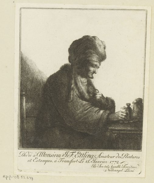 Curator: This is Giuseppe Longhi's "Portret van schilder Rembrandt," created in 1799. It's an engraving, a printmaking technique involving incising an image onto a plate. Editor: My first thought is the use of light – or, rather, shade. The stark contrast gives it such an intense, almost dramatic quality. It feels incredibly Baroque in its visual language. Curator: Exactly! The high contrast is paramount. Note how the white of the turban is juxtaposed with the dark background and robes. This tonal play serves to emphasize the subject's face, directing our gaze. Editor: It makes me think about the actual process of creating an engraving. How many hours of focused labor went into those precisely etched lines, the cross-hatching that builds up that chiaroscuro effect? And considering the cost of materials at the time... Curator: Good point! Structurally, the composition guides our eyes inward, from the outer edges toward Rembrandt's expression. Longhi brilliantly manipulates this perspective through varying densities of line. What statements, therefore, do you feel it communicates about portraiture during that period? Editor: Beyond simply representation, portraiture reinforced notions of class, skill, and patronage in late eighteenth-century artistic circles. Every line carries information that communicates those hierarchies and relations. Curator: Precisely. I observe that this is also Longhi interpreting Rembrandt in his way, two giants communicating across time and technique. The gaze engages you as a viewer and brings a feeling of immediacy across centuries. Editor: Seeing this portrait highlights how even seemingly straightforward images like this engraving carry intricate information and relationships related to creation, commerce, and the people it portrays. Curator: A poignant conclusion. These careful examinations reveal the layered visual architecture behind this compelling historical portrait.