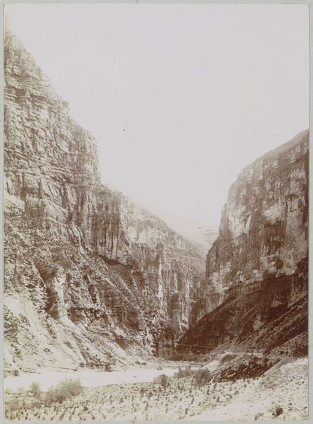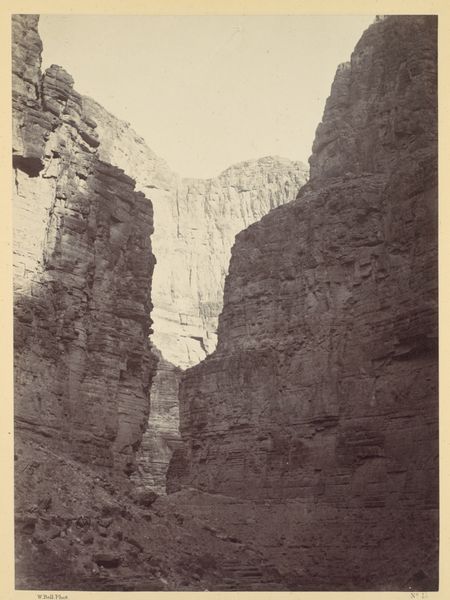 Editor: This is William Bell’s 1872 photograph, "Cañon of Kanab Wash, Colorado River, Looking North." It's stunning, though somewhat monochromatic. The scale feels immense, especially looking up into that sliver of sky between the canyon walls. What do you see in this piece from a formal perspective? Curator: Precisely that vertical thrust. The artist masterfully exploits the inherent tension between the static weight of the massive stone and the implied dynamism of its upward reach. Observe how the composition is structured through a play of light and shadow, the graded tones articulating the geological strata. Note how Bell uses linear perspective not for illusionistic depth but to accentuate verticality, thus emphasizing the canyon's structure as a monumental form. Editor: So you're focusing on the way the picture is put together, rather than what it represents? Curator: The "what" emerges from the "how". Semiotically, the stark contrasts between light and dark can be viewed as a binary opposition, a recurring structural motif. Ask yourself how the photograph engages with earlier traditions of landscape painting. Where do we find evidence of the Hudson River School’s influence on Bell's choices about composition, light, and tonal contrast? Is Bell simply documenting a location, or is he actively constructing an experience for the viewer through these techniques? Editor: I see what you mean. The stark contrast definitely creates a feeling of… austerity, maybe even sublimity. It's more than just a picture of a canyon. Curator: Exactly. Bell is presenting an arrangement of formal qualities: line, light, and tonality. Consider too, the texture—the roughness of the rock faces captured with incredible detail given the photographic technology of the time. What does this materiality communicate? It provides grounding and contrast with the atmospheric perspective towards the vanishing point. Editor: That's a lot to think about! I appreciate you pointing out how the different formal elements come together to shape our experience. Curator: My pleasure. These types of questions enable a greater appreciation of the artistic intention behind this compelling vista.