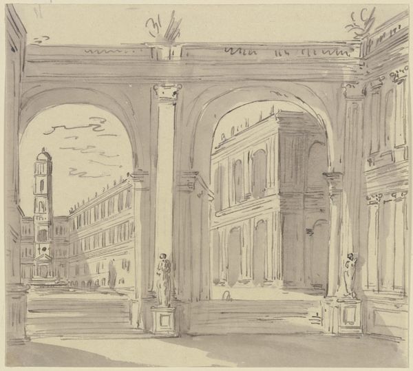 Curator: Let’s discuss this drawing by Charles François Daubigny, Gare Saint Lazare te Parijs, from the period of 1827 to 1878. It’s rendered in pencil. Editor: Oh, Paris. Even in graphite, it exudes that melancholy grandeur. You can almost hear the echoes of footsteps and whispered secrets. Curator: Precisely. Consider how Daubigny articulates architectural space through subtle gradations of tone and line. The receding planes, defined by variations in pencil pressure, generate depth and a sense of perspectival accuracy that is nonetheless subjective. Editor: True, but for me, it’s the lack of rigidity that’s so striking. There’s an airy quality here. Despite all that stone, there's this feeling of lightness, almost as if the whole scene could evaporate into the Parisian mist at any moment. Curator: That ephemeral quality speaks to the burgeoning Impressionist style he employed. Daubigny prioritizes the suggestion of form over precise representation, capturing the fleeting atmospheric conditions unique to that period of landscape art. Note the sketch-like quality around the fringes of the architecture—this adds a dreamlike feel. Editor: Yes, the incompleteness. It’s like Daubigny has captured a moment on the brink of disappearing, a feeling, rather than just a scene. He invites the viewer to become a fellow traveler in a space where time itself feels fluid. Curator: He renders a sense of modernity through formal means—drawing and composition. And so even what appears to be an underdrawing embodies this feeling of transformation. What do you take away, ultimately? Editor: A lingering whisper of beauty found in the everyday, a city caught between dream and reality, rendered in strokes of subtle genius. Curator: It is a testament to Daubigny's ability to convey depth of experience and understanding of art by the subtlest means.