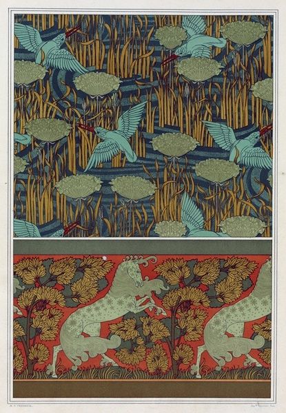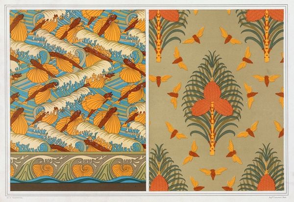 Editor: Here we have Maurice Pillard Verneuil’s wallpaper design from 1897, titled "Carpocoris, bordure. Aigles et pigeons, papier peint. Coquillages et algues, bordure," executed as a drawing and print. What strikes me is the interesting contrast of soaring eagles and peaceful doves set against a cloudy backdrop. What do you see in this piece from your perspective? Curator: From a historical standpoint, it’s fascinating to see how Verneuil, working during the Art Nouveau period, uses natural motifs not just for decorative appeal, but as a commentary on the relationship between power and peace. The eagles, traditionally symbols of imperial authority, are juxtaposed with doves, representing peace. Does this intended association enhance its public role and challenge conventional politics of the imagery displayed within domestic spaces? Editor: That's interesting. So you’re saying that, for its original audience, it might have carried a certain political weight? Curator: Precisely. Wallpaper wasn't just about beautifying a space; it was about communicating values. The repetitive nature of the design, combined with the inherent tension between the eagles and doves, raises questions about the ever-present negotiation between conflict and harmony within society. And the addition of marine life border—do you think those elements contributed to or detracted from the intended sociopolitical discourse of the work? Editor: That makes me see the wallpaper in a new light. The natural themes, while decorative, might reflect broader societal ideals and tensions during that era. It is an element that certainly enhances that conversation of design. Curator: Indeed. It reminds us that even seemingly innocuous design elements can reflect significant socio-political undercurrents. I also found a perspective I had not originally considered in the political context. Editor: Agreed. Examining this wallpaper has made me rethink how art can subtly convey powerful messages about society and politics, even in unexpected forms.