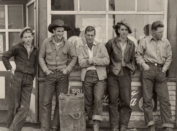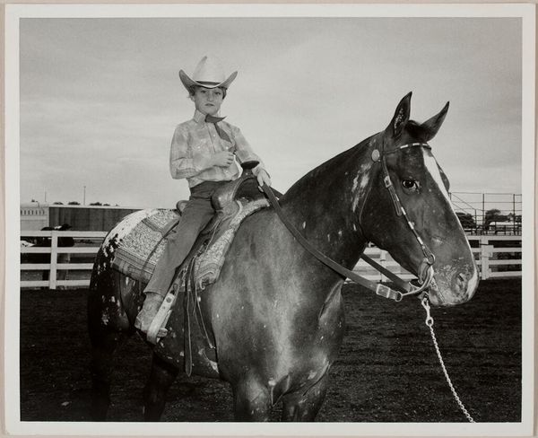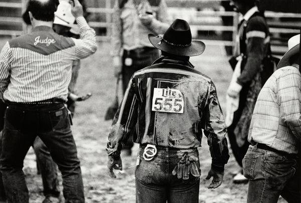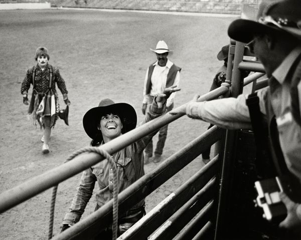 Curator: Nancy Andrews’ gelatin silver print, “The Rodeo, no. 4,” dated 1992, confronts us with an immediate, almost raucous energy. What is your initial response to the image? Editor: The dynamism is what strikes me first. The light, despite being a monochrome photograph, captures an ebullient moment of youthful energy and camaraderie. The composition, albeit staged, hints at a vibrant culture and timeless ritual. Curator: Andrews, in this piece, meticulously frames a group of individuals—ostensibly rodeo participants—engaging in what appears to be a ritualistic display of physical strength or perhaps even play. The spatial arrangement, the subtle gradations of tone, invite an almost structural reading of social dynamics. Editor: The central figure suspended between the group really arrests my gaze. It almost represents the vulnerability inherent in this world. This pose isn't just about muscle; it hints at submission, reliance, and an almost paternalistic element among the cowboys. There's this delicate interplay between masculinity and something softer. Curator: Precisely. Observe how Andrews utilizes the monochrome palette to accentuate textures and forms, allowing a certain flatness to pervade the image. This strategy undermines conventional depth, emphasizing a certain theatricality embedded within the rodeo subculture. Editor: Note also the symbolism of their garments, which are potent in cowboy culture. From the wide-brimmed hats to the decorative belt buckles, each element conveys a unique persona while still aligning the men with the visual motifs of American frontier life. And of course, Andrews, intentionally or unintentionally, has captured a cultural touchstone, frozen in time. Curator: Yes, but the genius lies in its presentation. Through a highly controlled framing, Andrews constructs a meta-narrative that encourages viewers to dissect both the aesthetic and cultural signs manifested in "The Rodeo, no. 4." Editor: It is truly rich with iconographic value, wouldn't you agree? It reminds me that while social performances are fleeting, their symbolic meanings resonate powerfully within us all. Curator: Indeed. Andrews compels us to actively confront how we frame, construct, and inevitably, comprehend the cultural theatrics that govern the way we express ourselves within both social and historical realms. Editor: It gives one so much to ponder about how we view historical identity!