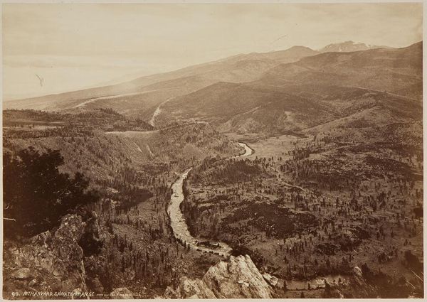 This photograph, 'Gezicht op de Sioule in de Auvergne' by Delizy, captures a serene landscape with what looks like albumen on paper. The warm sepia tone gives it a timeless quality, making the scene feel both distant and immediate. I love how the light plays across the water, creating subtle gradations of tone that give depth to the composition. The texture of the rocks on the left, with their rough and uneven surfaces, contrasts beautifully with the smoother, more reflective surface of the river. Those tiny boats in the river suggest human presence without disrupting the tranquility of the scene. Looking at this piece makes me think of Gustave Le Gray, another photographer who captured landscapes with such a keen eye for light and detail. Like many great works, it's not about a single, fixed meaning but about the endless possibilities of seeing and feeling.
