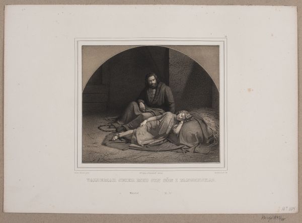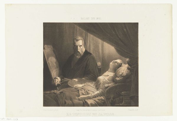Curator: Today we’re looking at "Graaf Eberhard bij het lijk van zoon Ulrich," created between 1853 and 1865 by Adolf Carel Nunnink. It's housed right here at the Rijksmuseum, a poignant engraving printed on paper. Editor: It's somber. Immediately, the overwhelming grey tones communicate grief. You have the rigid formality of the armor on the dead son juxtaposed with what seems to be the raw sorrow of the father. It feels theatrical, even operatic. Curator: Exactly. This is Romanticism drawing upon historical painting— specifically, genre scenes to explore deeper questions of mourning and power dynamics within the family. Consider how societal expectations surrounding male grief are challenged in this scene, right? Editor: Absolutely. Thinking about the materiality, engravings inherently possess a reproducible quality that democratizes art. How many impressions were made? And did the reproductive nature of this engraving speak to issues of access in 19th-century art viewership, challenging the singular, unique art object? Curator: Certainly. And this act of memorializing a patriarchal lineage for public consumption reinforces dominant power structures but simultaneously acknowledges the emotional vulnerabilities of the ruling class. We can discuss what it signifies to show powerful men in moments of vulnerability or defeat, challenging conventional masculinity and how this moment shapes collective historical memory. Editor: The precision of the engraving tool itself demands a meticulous process, which contrasts beautifully with the subject's inherent messiness – death, grief, loss of dynastic continuation. There’s also the contrast of scales in the production—from individual engraver to potential mass printing and dissemination of imagery. How did the tools affect Nunnink's own emotional investment in crafting this engraving? Curator: Considering contemporary intersectional perspectives, what narratives might this engraving obscure, particularly regarding marginalized voices absent from its patriarchal framework? How can this depiction further perpetuate cycles of privilege? It certainly invites questions of visibility and power… Editor: An object inherently entangled with labor and production – which is further complicated as those systems change over time with industrialization, right? The tools, the presses—their influence is present in the final product. Curator: Agreed. Analyzing the print through an activist lens requires us to acknowledge historical power dynamics, while a materialist approach offers a tangible sense of the labor involved. Editor: It's through both the critical, engaged readings that challenge normative historical framings and understandings of process and creation that our reading of the print's layered impact is truly expanded.