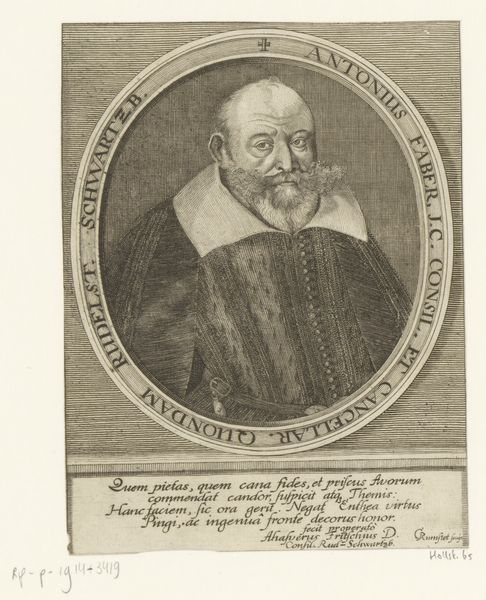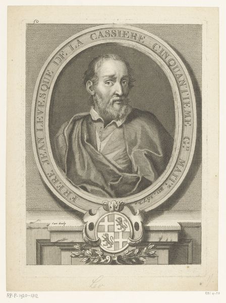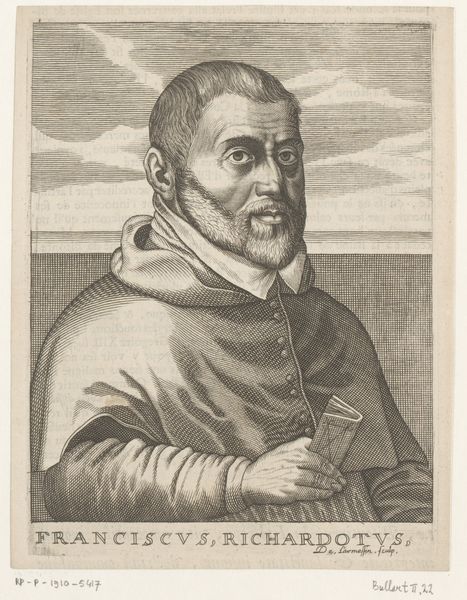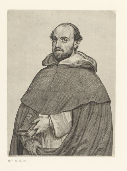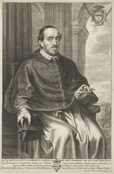 Editor: Here we have Conrad Lauwers' "Portret van Marius Ambrosius Capello," an engraving from the period 1642 to 1685. It feels very formal, almost staged, because of its traditional composition and serious tone, and of course, the graphic quality given that it's a print. What can you tell me about it? Curator: Looking at the material processes employed here—the very act of engraving, the multiplication of images it enables—allows us to see beyond the sitter's clerical status. Think about the labor involved, the skilled hands meticulously etching the copperplate. What were the social conditions that supported such skilled artisans? The consumption of such prints was fueled by new markets where these engravings were in demand. Editor: That's interesting. So it's not just about portraying an important person, but about the business of making and selling images? Curator: Exactly. The materiality of the print, its existence as a multiple, cheapens and democratizes the image. This challenges any idea that this portrait serves exclusively to reinforce Capello's authority. The engraving style, and mass distribution made them cheaper than hand painted works, expanding accessibility for various consumers in society and their place of consumption. How does this affect your reading of his expression, knowing that potentially hundreds of people could have owned this image? Editor: It definitely makes him seem less untouchable. Thinking about who owned these prints… regular people looking at this Bishop. It really does change things! Curator: Indeed. By considering the print's means of production and circulation, we uncover complex social relationships that extend beyond the traditional scope of art historical analysis. It is very exciting isn't it! Editor: Definitely gives me something new to consider when looking at older art! Thanks.
