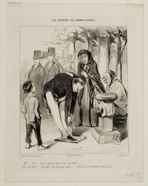 Curator: This black and white print, "Une Récompense Artistique," or "An Artistic Reward," is by Honoré Daumier. Editor: It strikes me as a bit sinister, actually. The sharp lines create a tense atmosphere. Curator: Daumier often used caricature to critique society, and this piece, while humorous, reflects on cultural misunderstandings. The musician seems to be receiving a rather grim form of appreciation. Editor: Yes, the contrast between the European musician and the bowing figures with their ceremonial sword is so sharp. It seems to highlight a clash of cultures and traditions, almost mocking the exoticism of "the Orient." Curator: The musical score, the dark robes, it all plays into Daumier's sharp satire. Editor: The musical reward is not what you'd expect. It definitely highlights the artist's perspective.