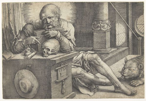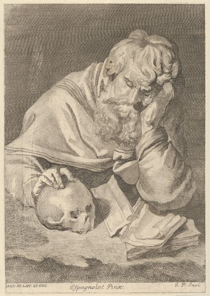 This print, titled "Gulzigheid", was made by Jean de Weert in the 17th century. The dominant image is of a man clutching a large vessel, his expression one of profound absorption. This vessel, a container of sustenance, becomes an emblem of "Gulzigheid" or "Gluttony", a vice that has preoccupied artists and moralists for centuries. Consider the vessel as a symbol. In ancient Greece, the amphora held not just wine or oil, but also stories and rituals. Here, the vessel overflows with a different kind of content: insatiable desire. We can find echoes of this motif in later works, where the cornucopia, similarly brimming, represents abundance, but also the potential for excess. The way the man embraces the vessel is telling. It's an almost desperate embrace, reminiscent of mythological figures clinging to objects of power or obsession. It is a timeless psychological tableau, capturing the human struggle with desire and the fine line between sustenance and self-destruction. The motif is not linear, but cyclical, resurfacing and evolving across different eras.