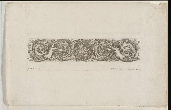 Stefano della Bella made this print, Plate 5, using etching techniques in the 17th century. It shows two horizontal bands of elaborate ornamentation. Della Bella was an Italian printmaker who spent a decade in Paris during the reign of Louis XIV. It was a time when the decorative arts played a key role in defining French national identity and in projecting an image of power and sophistication to the world. Della Bella made prints such as these to provide patterns for other artists and artisans to use. The flowing lines and grotesque masks reference classical antiquity but updated for the tastes of the French court. The fact that Plate 5 is part of a series suggests the growing institutionalization of art and design. To understand it better, we can look at the history of the French Royal Academy of Painting and Sculpture, the Gobelins Manufactory, and other institutions that shaped artistic production at that time. By situating works of art within their historical context, we can learn about the complex interplay between art, culture, and power.