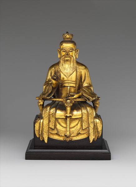 Editor: Right, next up we have a bronze sculpture from, most likely, the Ming or early Qing Dynasty titled "Daoist God Zhenwu, Supreme Emperor of the Dark Heaven." The figure is seated, seemingly lost in thought. It has an austere, quiet mood and, frankly, makes me feel at peace. What stands out to you when you look at it? Curator: Well, my dear Editor, doesn’t he just emanate tranquility? For me, the bronze sings of both earthly power and spiritual transcendence, like a celestial opera playing out in metal. Look at the intricate detailing on his robes, then compare it to the utterly still, smooth surfaces of his face and hands. It’s like the world’s noise giving way to perfect inner peace. Do you think the artist intended to evoke a sense of inner silence? Editor: That’s interesting - inner silence. I was too focused on the external stuff! The robes are gorgeous; I noticed those right away. It's interesting how, despite the rigid material, the sculpture feels flowing, natural. But "inner silence"? That is new to me. Curator: The flow of the robe also adds to his stature, while also not weighing him down. What stories do you imagine lie behind the creation of the statue, knowing it’s from that time? Editor: Well, I wonder what was happening culturally, I suppose, since Daoism seems so baked into the culture… hmm… I really do love learning new things; I never expected I would have so much to consider with this. Curator: Each encounter like this is another stone laid down in the grand construction that makes us richer within, isn't it?