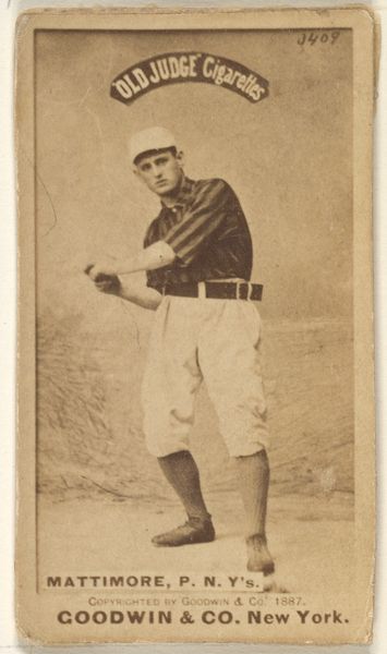 Goodwin & Company produced this baseball card of John F. Roach, a pitcher for New York, as part of the Old Judge Cigarettes series. These cards emerged in the late 19th century, a time marked by industrial growth and evolving social norms. Baseball was becoming America's pastime and, like many things in that era, was deeply entwined with commerce and expanding markets. These cards were essentially advertisements, small portraits packaged with cigarettes, offering a glimpse into the lives and aspirations of athletes. The image presents Roach as a figure of strength and precision. Yet, it’s important to remember that this representation, like many at the time, was carefully constructed. These cards helped to create celebrity culture, shaping perceptions and projecting ideals of masculinity and success. But who got to be a celebrity and who was left out? Consider that the baseball league was segregated, and these images were overwhelmingly of white players. This card invites us to reflect on how images create and sustain cultural narratives. It's not just a picture of a baseball player. It’s a piece of a larger story about who we choose to celebrate and the values we project onto them.