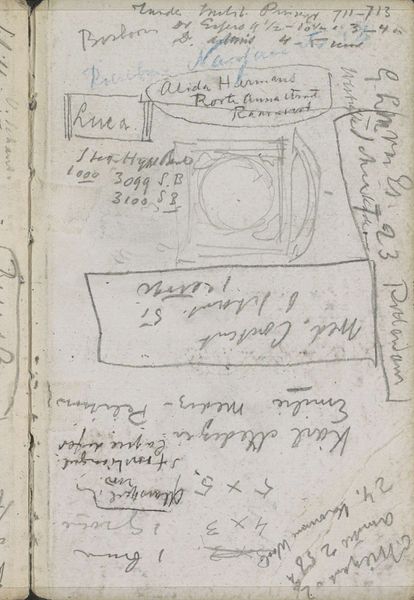 Editor: So, this is "Studies en annotaties" by George Hendrik Breitner, created sometime between 1896 and 1901. It’s a pencil drawing on paper, currently held at the Rijksmuseum. The page has this aged look with handwritten notes alongside sketched forms. What strikes me is the intimacy of it - it's like a peek into the artist's personal sketchbook. What do you see in this piece? Curator: Well, putting my historian's hat on, I see a fascinating artifact of artistic process and the socio-cultural context in which Breitner operated. The sketch book, as a material object, speaks volumes. These glimpses into his notes are really amazing. Can you see that faded lettering and annotations scattered across the page? Those provide valuable clues into how he perceived and processed the urban landscape around him. This personal "Studies" demonstrates a different, even informal perspective compared to his larger-scale works that we're accustomed to seeing on display. The question is, how might its informal presentation affect how this sketch could have been received, relative to a painting in the Rijksmuseum at that same moment in time? Editor: That’s interesting! So, the sketches, combined with these almost scribbled notes, offered a window into both the planning and private, unrefined thoughts behind it all? Was this accessible at the time to the average citizen visiting the Rijksmuseum, or mostly only available to Breitner? Curator: Exactly! These notations offer insight into how artists made decisions in art, that have largely been obscured over time and unavailable for study outside of similar sketchbooks by other artists. However, remember, art museums have been around much longer than modern academic approaches to art history, which means the political implications of Breitner putting this "raw," as it were, behind a picture frame. Editor: This gives me a whole new perspective on the function and cultural importance of such commonplace, simple objects like a sketchbook! Thank you. Curator: Indeed, viewing artworks such as these as products of socio-historical structures allows us to re-evaluate our understanding of both "what" and "why" something has been produced.