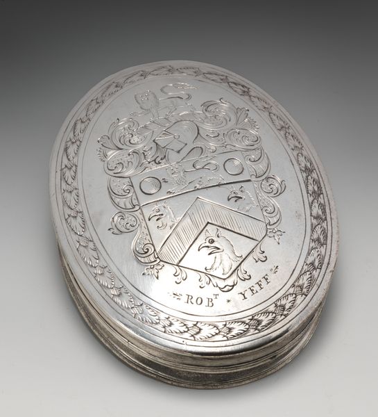 Editor: Here we have a silver tobacco box crafted around 1714 or 1715, made by Nathaniel Lock. Its surface is so smooth and reflective. It's quite small, and the engraved design is really detailed. What can you tell me about its historical context? Curator: Well, consider the societal role of tobacco in the early 18th century. It was more than just a habit; it was a ritual, deeply ingrained in social life. These ornate boxes, like this one made of silver, signified wealth and status. Owning one demonstrated a family's economic power and their integration within a social hierarchy. Notice the coat of arms. Do you think that gives us further insight? Editor: Yes, I noticed that too! I’d guess it signifies that the commissioner or first owner was of noble lineage. Curator: Exactly! The "politics of imagery" here are crucial. A coat of arms wasn’t just decorative; it visually asserted privilege and historical pedigree in a society still highly structured by class. Now think about where this object would have been displayed – a coffee house, a private drawing-room, public spaces all governed by unspoken rules. Editor: So it’s meant to signal social standing wherever the owner might take it? Almost like a wearable social media badge. Curator: Precisely. And the material matters. Silver wasn't just aesthetically pleasing; its value confirmed and amplified the message conveyed by the design, reinforcing the owner's position in society. What do you make of its presence in a museum setting today? Editor: That’s interesting because, in the museum, it is separated from the ritual it was initially part of. It’s just a visually beautiful artifact and we no longer read the intended societal signals of class so easily. Curator: Precisely. Its presence highlights how museums transform objects. Context dictates understanding, doesn’t it? Editor: Absolutely. Seeing this tobacco box has made me consider how much an object's meaning changes as it moves through time and institutions.