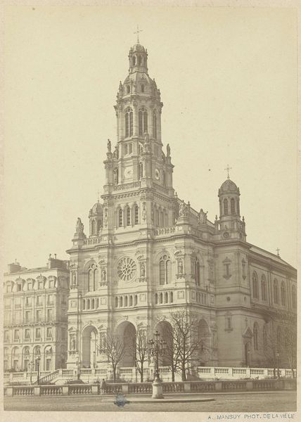 Curator: This gelatin silver print captures "Gezicht op het stadhuis in Brussel," or "View of the Brussels City Hall," taken sometime between 1870 and 1900 by Louis Antoine Pamard. What's your first take? Editor: It’s imposing, definitely a portrait of power. All that detailed architecture reaching towards the sky makes the building seem almost godlike, like a civic cathedral of sorts. Curator: The photograph itself becomes part of that story. A gelatin silver print means a specific historical production. We’re talking about industrialized darkroom practices, a shift towards mass reproducibility that allowed images like this to circulate widely, reinforcing those ideas of civic pride and authority across social classes. Editor: The tower’s ornamentation... It's practically dripping with symbolism. Look at the spire, reaching upwards, asserting dominance but also aspiration. Consider the figures placed deliberately to make you feel small and appreciate the magnitude of civic ideals represented by the City Hall. Curator: And think about the labor involved. Not just Pamard in the darkroom, but the construction of the City Hall itself. The raw materials sourced and transported, the stonemasons and craftspeople whose work is etched in every detail of the facade. This wasn't just about symbolism; it was about the physical embodiment of communal effort. Editor: Absolutely. The gothic revival style itself harkens back to a romanticized medieval past, invoking ideas of community and craftsmanship, and then layered with symbols and iconographic references that connect present aspirations with imagined histories. Curator: But let’s also consider that a photograph is never neutral. Pamard chose his angle, the time of day, perhaps even directed the placement of figures to emphasize his chosen narrative about the city's grandeur. These details are constructed as carefully as the building itself. Editor: And they carry weight, defining how we understand the city's values. It’s an expertly crafted stage for Belgium to declare itself in a modern age. Curator: So, in examining "Gezicht op het stadhuis in Brussel," we see not just a building, but the intersection of materials, labor, and symbolic power, each reinforcing the other. Editor: Indeed. A silent story about aspirations etched in stone and captured in silver.
