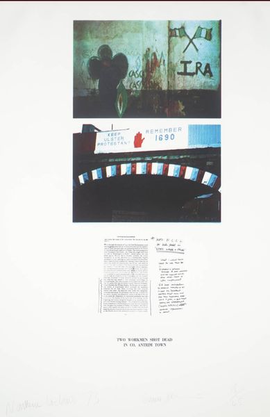 Curator: This is Ian Tyson’s “[title page]”, a suite of six screenprints inspired by a postcard fragment from Illiers-Combray. Editor: It strikes me as starkly graphic, almost like a document. The high contrast emphasizes the interplay of text and image. Curator: Indeed. Tyson is drawing on Proust’s themes of memory and place, using the postcard itself as a symbolic artifact. The text becomes a visual element. Editor: The screenprint medium reinforces this idea. The flatness and precision create a sense of removed observation. It’s as if we're studying a memory rather than experiencing it. Curator: Precisely. The postcard becomes a vessel carrying layers of cultural and personal significance. The imagery and text combine to evoke the past. Editor: The restricted palette adds to the contemplative mood, encouraging us to pause and sift through those layers. An intriguing visual exploration.