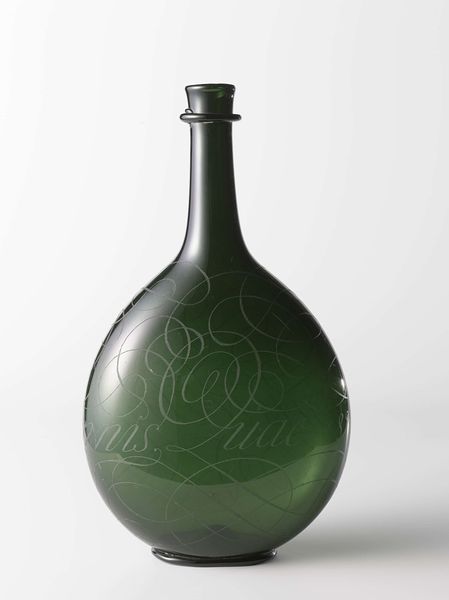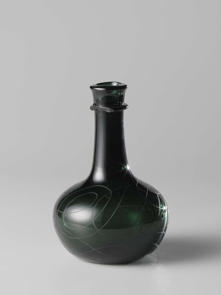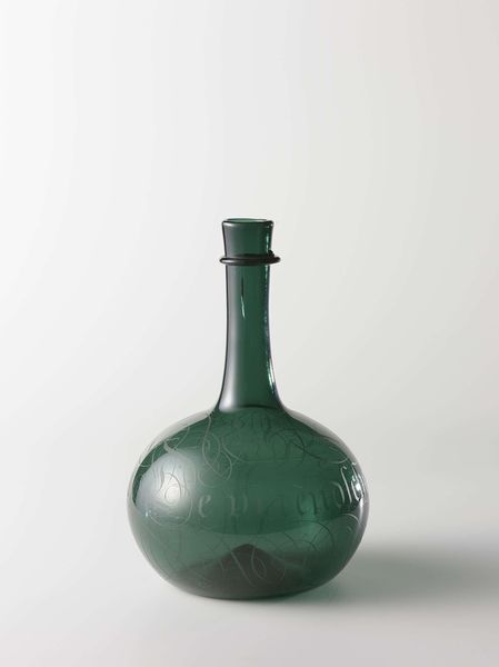 Editor: Here we have a glass bottle from 1683, the inscription reads "Hoogmoed gaat voor den Val", it's made from glass and potentially ceramic, depending on how it was made. I’m really struck by how delicate and ephemeral the glass seems, considering its age. What is your perspective? Curator: It's crucial to look at the material history here. This bottle, its production – how was this glass made, by whom, and under what conditions? The engraving too; this wasn’t mass-produced. Think of the specialized labour involved in creating this single object. This wasn't mere craft; it speaks to early mercantile capitalism. Do you see it that way too? Editor: That's fascinating! I hadn't thought about the production process in such detail. Knowing the glass isn't simply "there" but produced through specialised labor transforms my understanding. It highlights the skilled artistry behind what might seem like a common object. So, you see the inscription "Hoogmoed gaat voor den Val" as less about individual morality, and more about production of it's own value? Curator: Exactly. “Pride precedes the Fall”. Whose pride are we talking about? Not the user of the bottle, I posit. Instead, this text implicates the pride and toil taken by the maker, imbuing the piece with symbolic and economic meaning. It’s labour manifest in material form. Editor: So, it's more than just a decorative bottle. It becomes a vessel containing the history of its making, both physically and socially. It also shows the cultural values around pride that time! Curator: Precisely. Now consider how the meaning might change depending on the viewer, and the purpose for which this bottle would be intended, who would be filling it, and with what? Editor: That gives me a much broader and critical appreciation of this object and I will consider materials and labour of creation as part of the analysis of artworks going forward! Curator: Wonderful! Approaching art through its materiality gives voice to the silent histories embedded within.