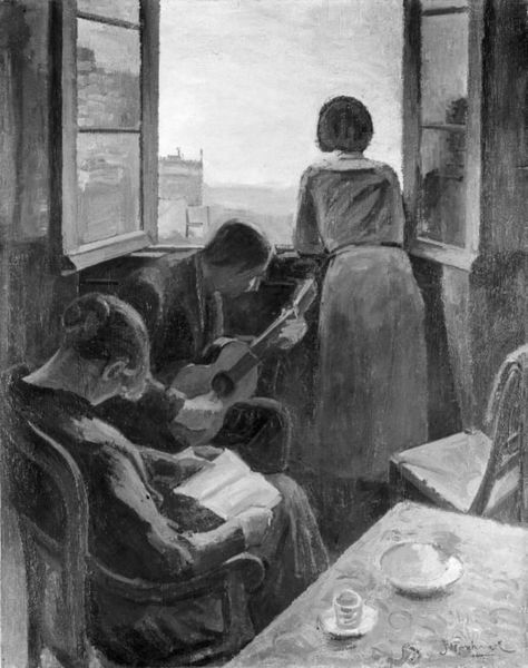 Curator: Silvestro Lega’s work, "The Lesson," completed around 1881, offers us a peek into a late 19th-century Italian domestic scene, painted with a subtle Impressionist touch. Editor: There's an incredible sense of stillness in this painting. The palette is quite muted, but it imbues the scene with an air of gentle melancholy. I'm drawn to the way Lega captured the intimacy of this lesson—who do you think the women are to each other? Curator: Art historians have speculated that it could be a grandmother teaching her granddaughter, or perhaps even a tutor. Considering the context of the time, the rising bourgeoisie valued education for young women, emphasizing skills like reading and needlework that would equip them for their societal roles. Editor: So, this "lesson" might have been about reinforcing social expectations just as much as it was about acquiring literacy? The woman's posture feels somewhat…overbearing, like she's not just guiding but also enforcing a standard. How were women encouraged, or rather pressured, to perform this "ideal" in nineteenth-century Italian society? Curator: Precisely. While education could open some doors, it was often geared towards refining women for marriage and domesticity. There was a constant societal pressure, visible in contemporary literature and art, to embody an image of piety and grace. The brushstrokes certainly soften that social demand, however, which contributes to that pensive tone that is established in the artwork. Editor: I agree, and looking closely at the brushwork and color choices it's very evident. This interplay between social constraint and individual expression resonates deeply. The scene, though seemingly quiet, hums with the tension of prescribed roles. It prompts one to think, is she truly learning, or being molded? Curator: Indeed. By considering that duality, the image gives viewers an awareness of the political nuances that operate within something as quotidian as an educational lesson. The scene reminds me that art can serve as a mirror reflecting—and also challenging—social norms of the past. Editor: Ultimately, it highlights how the concept of "a lesson" could symbolize the transmission of not only skills but also power dynamics between generations and genders. It’s quite a thought-provoking, unassuming piece. Curator: Absolutely, seeing this painting is always insightful! It pushes me to investigate how these scenes operate in the grander narrative of Italian cultural heritage.