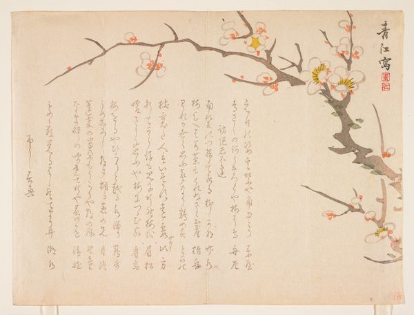 Ryūryūkyo Shinsai created this woodblock print titled "Plum Tree in Bloom" in Japan in the early 19th century. The "Spring Rain Collection," of which this print is a part, suggests a connection between natural imagery and the literary and artistic culture of the time. The plum tree, rendered with delicate lines and subtle colors, is not merely a botanical study but a cultural symbol. During the Edo period, when this print was made, Japan experienced a flourishing of the arts, with institutions such as painting schools and print workshops playing a significant role. The presence of calligraphy alongside the image is particularly noteworthy. Poetry and images were often paired, reflecting the high value placed on both in Japanese society. To fully understand this print, we might delve into the history of Japanese printmaking, explore the significance of plum blossoms in Japanese art and literature, and examine the social networks that supported artistic production. Each artwork is contingent on cultural and institutional context, revealing the intricate interplay between art and society.