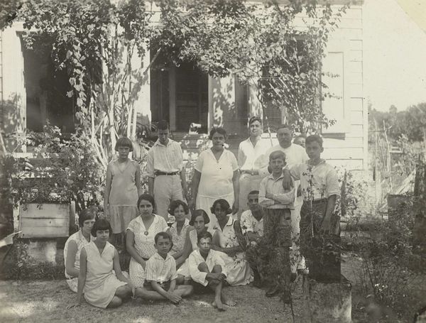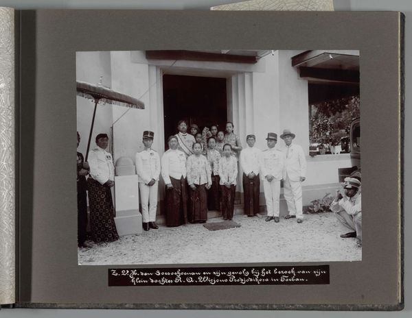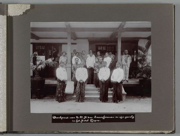 Editor: Here we have "Afdeling Prijzen- en Ambtenarenstatistiek van het Centraal Kantoor voor de Statistiek te Batavia," a photograph likely from 1935, by an anonymous artist. The sepia tones and formal arrangement give it such a stately, old-world feel. I'm struck by the individuals depicted, wondering about their lives. What's your take? Curator: Oh, it whispers stories, doesn't it? To me, it’s more than a group portrait; it’s a portal. Imagine Batavia, now Jakarta, in 1935. The Dutch East Indies, simmering with change. Look closely – those faces, a mix of colonial administrators and local staff, caught in a delicate dance of power and progress. Are they proud? Resigned? Or just plain hot in those white suits? I wonder...what’s reflected in their eyes? Perhaps ambition, maybe a hint of apprehension. What about the architecture behind them? Doesn't it strike you as a carefully constructed symbol of colonial authority, softened only by the tropical vegetation? Editor: Absolutely. The building almost feels like a character in itself. The photograph reminds me to consider multiple perspectives when I think about art history. Curator: Exactly! And what seems so formal on the surface becomes wonderfully complex the deeper you delve. That push and pull, the visual and historical... it's why I keep looking, keep asking questions. Keeps the art alive, don’t you think? Editor: It does indeed. It definitely encourages one to think critically about photographs like this, instead of seeing them at face value. Thanks for the insight.
