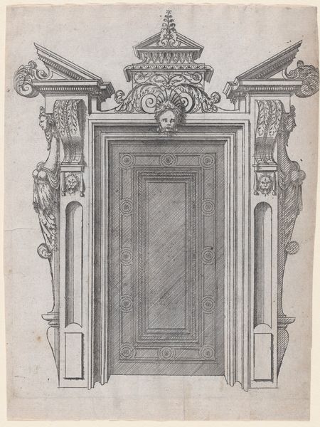 Editor: This is "Poort van het Frans Loenenhofje in Haarlem," an engraving and drawing on paper from 1874. It depicts the gate of a courtyard in a detailed architectural style. It's so precise! What do you make of it? Curator: Oh, that gate whispers stories! For me, it's not just about architectural accuracy. Look closely at the stone, seemingly immutable, rendered with such a delicate touch. The artist allows the line to dance, almost breathes life into the stoicism of neoclassical form. Editor: You mean the drawing feels kind of…alive? Curator: Precisely! Doesn't it feel like something more than a simple representation? It teases with its reality. There's a certain, how should I say, playful severity? Do you catch the little head peering down from above the keystone? He winks at the viewer. Editor: I see him now! It’s unexpected, isn't it? The gate is grand, but that face makes it more…personal. Curator: Indeed! Think of it, perhaps, as a knowing guardian. Almost impish in nature! Tell me, what feeling does it evoke in you, now that you've noticed the whimsical details dancing amongst the stern architecture? Editor: I suppose it seems warmer, more inviting than I first thought. A solid invitation that history opens before us. Curator: I couldn't agree more. Each line invites us to look more carefully! The dance continues! Editor: It's amazing how one small detail can completely shift my perspective. I learned a lot about art today, thank you! Curator: My pleasure! Isn't it amazing how our perceptions change and morph as we discover new facets to any object! It certainly changed my view, too!