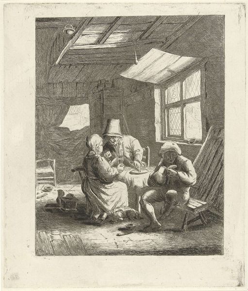 Curator: It's amazing how much life Christina Chalon packed into such a small space, isn’t it? This is her etching, "Ochtentoilet," thought to have been created sometime between 1758 and 1808. Editor: Intimate, isn't it? The textures alone draw you right into that little Dutch home, that sense of close quarters and familial life... almost a little claustrophobic, actually. Curator: The busyness of everyday life is evident, wouldn't you agree? A mother attending to her children... Look at the care in her face as she fastens that little shoe! Editor: Absolutely, and there’s a very specific gaze being offered here. It's the familiar weight of the labor often invisible: dressing children, mending clothes. Where’s the father? Absent from the frame, but very present by his omission. The labor of care consistently, overwhelmingly, falls on women's shoulders. Curator: True. It feels honest. She gives you not just the prettiness, but also the... well, perhaps monotony of the scene. She shows that beauty isn't always the shining star. Sometimes, beauty resides in being able to simply manage another day. The pen strokes themselves create this feeling: a beautiful mess. Editor: It makes me consider, too, the implications of such domesticity within the art world. Genre painting has long been deemed secondary, less worthy. Was Chalon pushing against that, embedding critical commentary into an everyday moment? Or perhaps, were women allowed to show only the everyday? Curator: Perhaps a little of both, perhaps neither. Ultimately, it leaves me in a nostalgic daze, this one. Childhood, in all its simplicity... Editor: Nostalgia, sure. But I see also a crucial archive. Christina Chalon captures, within those delicate etched lines, the lives, labor, and historical experience of women so frequently left out of the bigger picture. It’s lovely, and politically profound.