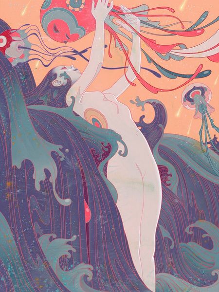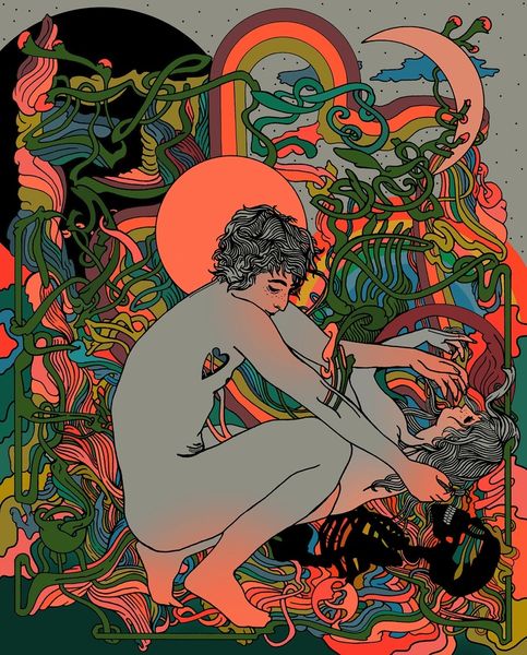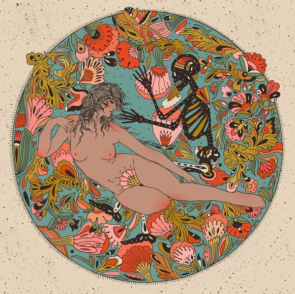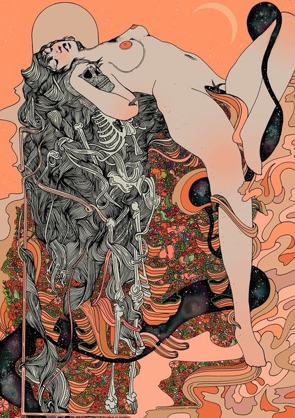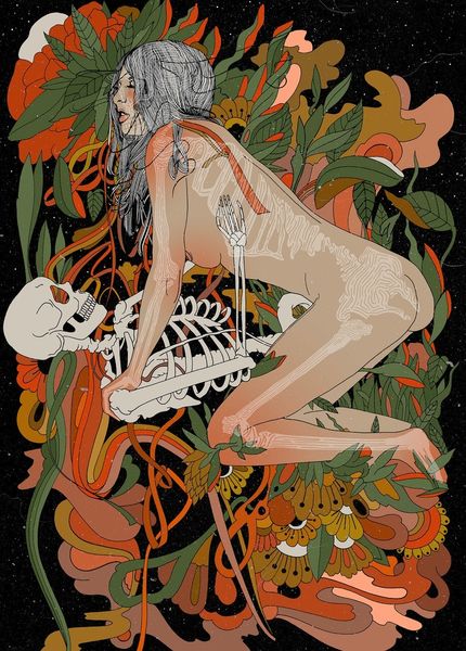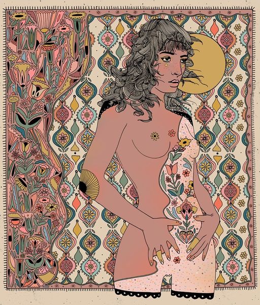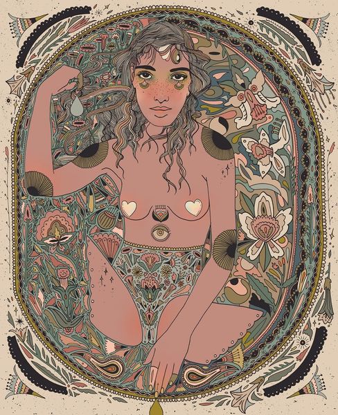 Curator: The artwork we're viewing is titled "Autumnal Rebirth" by Cassidy Rae Marietta, a mixed-media piece incorporating acrylic paint, among other materials. Editor: Immediately, I'm struck by this dreamy, psychedelic aura—almost like a vintage poster for a folk horror film, or a forgotten tarot card. There is such a bold sense of layered, almost overwhelming, detail that reminds me of some forgotten mythology. Curator: It’s interesting you say that. There's a recurring motif of florals and foliage framing the figure, hinting perhaps at themes of nature intertwined with feminine identity. Editor: Yeah, her positioning in this natural setting has got me thinking, almost cocoon-like, awaiting some sort of metamorphosis. It reminds me of like... the turning of seasons, letting go to transform. The pattern obscuring the lower half of the nude body is like the end of her earlier body as it begins this transformation. I also noticed a lack of date; why do you think it lacks it? Curator: The lack of a definitive date raises several points. We must then interpret the work outside of a chronological understanding. Does this enhance the reading of "Autumnal Rebirth?" Or does it detract from the original artistic intentions of Marietta. There are varied possibilities when interpreting artworks like these. Editor: Exactly! It really speaks to the timeless cycle, you know? The nude human becomes a vessel, adorned not by clothes, but the promise of what can be. Does that sound too heady? I get that some would view the use of the body as pure shock value. Curator: The use of the nude figure certainly situates it within a broader discourse of representation, as it raises valid issues regarding who and how it serves different demographics. In this context, I don't think we could immediately associate a certain shock value or anything malicious behind its intent. Rather, if anything, it continues to serve as a symbol for cultural ideas associated with nature. Editor: That feels so on point for me now too. Like a visual reminder that endings can bloom into beginnings. You feel? Curator: Absolutely. A vibrant encapsulation of change, culturally and aesthetically, as well as personally for each individual's own experience.