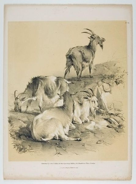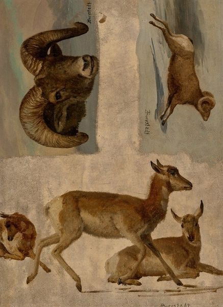 Curator: Here we have “Studies of an Isard” by Rosa Bonheur. Look at this lively assembly of goats, quickly rendered in what appears to be oil paint on paper. There is a spontaneity, a sense of immediate observation. What's your initial impression? Editor: It feels almost primal, in a way. These aren't just animals, they’re symbols of resilience, maybe even wildness. I immediately think of the role of animals in folklore, especially those dwelling in the high mountains. Are these Isards particular to one specific range? Curator: Isards, also known as the Pyrenean chamois, are native to the Pyrenees mountains of Europe. Bonheur clearly relished capturing their unique form. Consider the variety of poses. She has really nailed the texture of their coats with just a few strokes. Editor: You're right about the texture. Notice how each pose communicates something different, and even their fur seems to embody individual character and movement. These weren’t simply copies from taxidermied examples but from nature and memory, full of individual nuances. It's as if she's tapping into something deeper than mere representation. Perhaps it ties to ancient earth-mother symbolism often associated with horned creatures? Curator: Possibly! Bonheur, as a woman artist in the 19th century, was keen on bucking trends in the industry. This drawing underscores the prevailing interest in the scientific approach, to which she responded in her unique way. We see this blending of observational drawing with the new technology of manufactured paints. Editor: Her connection to the natural world seems particularly strong here. Considering her unconventional lifestyle – she openly defied gender norms of her time – do you think she consciously employed this symbolism to challenge social conventions, reclaiming the wild feminine through representations of animals like these isards? Curator: Interesting to think about that connection, yes, and maybe further research into this would open an interesting avenue to think more on this subject. Editor: It really has sparked my mind. Curator: Me too. Thanks for providing a lens to help see Bonheur's work differently.