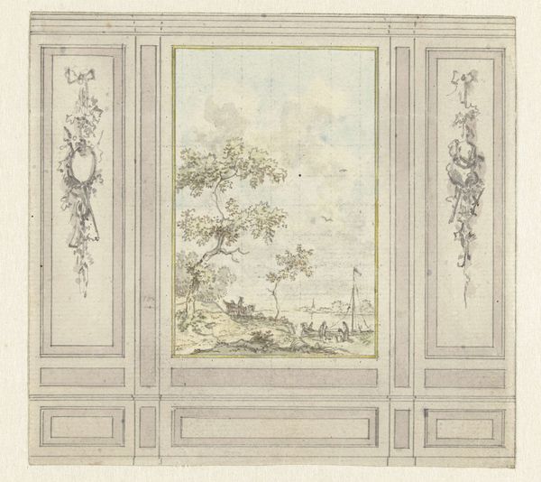 Editor: This watercolor and ink drawing, "Ontwerp voor kamerwand," which translates to "Design for a Wall Panel," by Jurriaan Andriessen, dated c. 1752-1819, depicts a stately doorway flanked by idyllic landscape scenes. The balance of the architecture against the painterly landscapes strikes me; the whole composition exudes formal elegance, and yet also feels quite serene. What do you make of it? Curator: The power of this piece lies in its structured harmony. Note the emphasis on linear perspective and the carefully calibrated spatial relationships within the landscape panels. The eye is drawn from the foreground elements back to the atmospheric distance through precise tonal gradations. It operates under Neoclassical aesthetics but remains heavily ornamental. Do you notice any of those tensions in the composition? Editor: I see it now! The classical symmetry and idealized nature are definitely there, especially compared to the more fanciful Rococo style of the previous decades. But the wispy brushstrokes of the watercolor make it softer, maybe even a little more romantic? Curator: Precisely. And it's not merely representational; the placement of forms and colors seems intent to create an ideal form, like a visual equation. Consider how the curves in the foliage balance the rectilinear architecture. It evokes an Arcadia, yet anchored by structured forms. Editor: So, it's about striking the right balance, not just painting a pretty picture. I am getting more from the structured shapes and how those two elements contribute to my experience with the piece. Thank you. Curator: Exactly. By engaging with this balance, this equilibrium between natural and constructed forms, you gain access to its inherent power. A balance not only of shapes, forms, color, but also one between the idyllic landscape and architectural drawing styles.